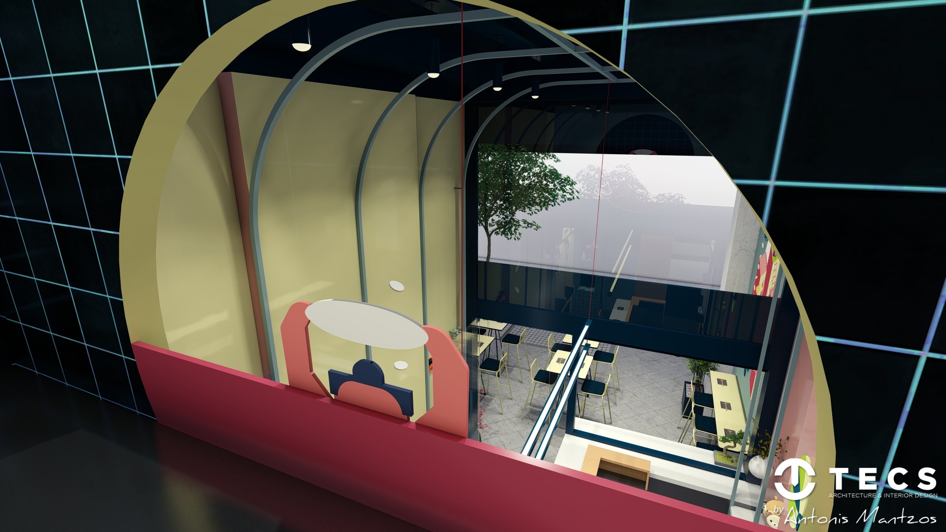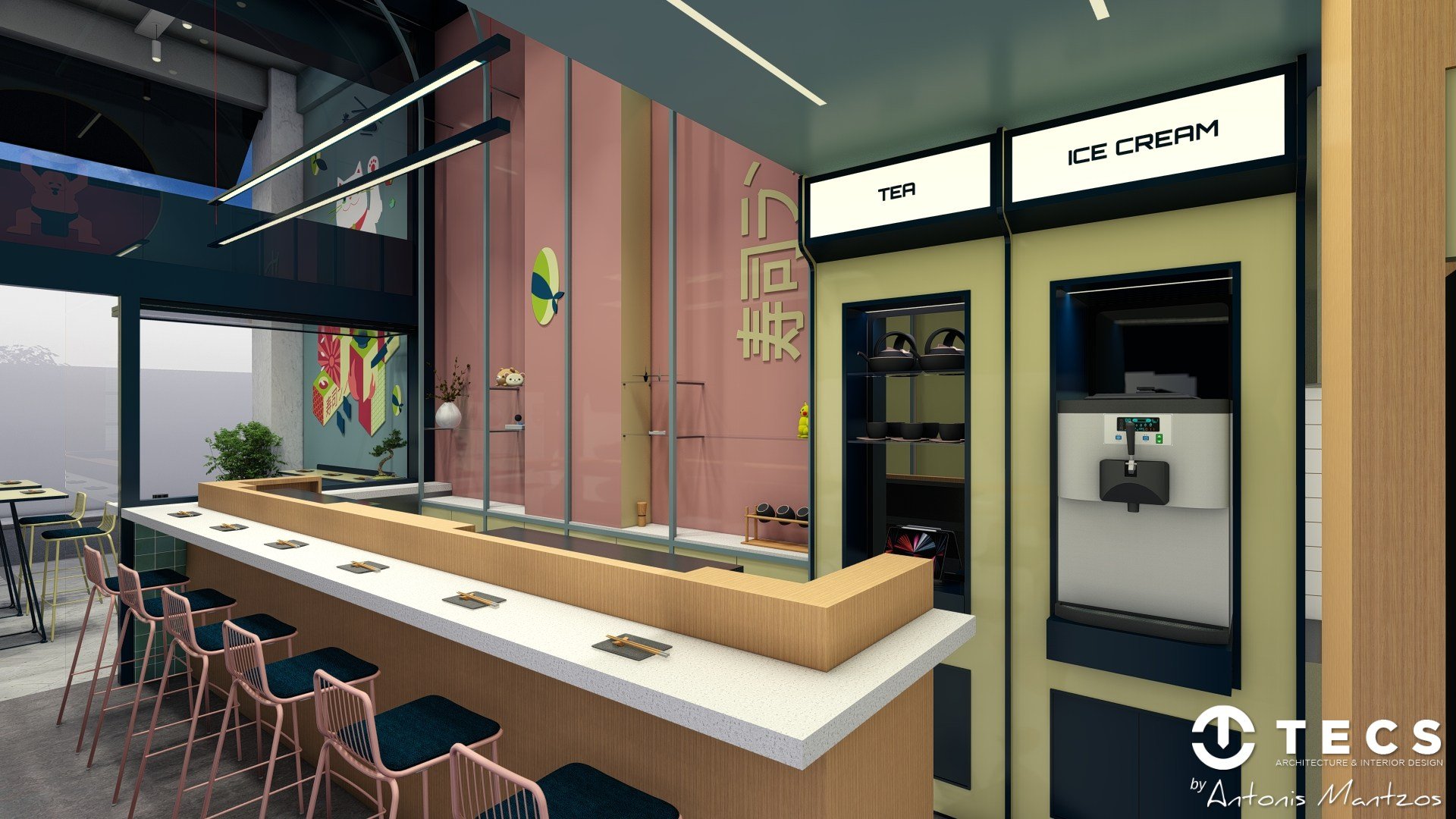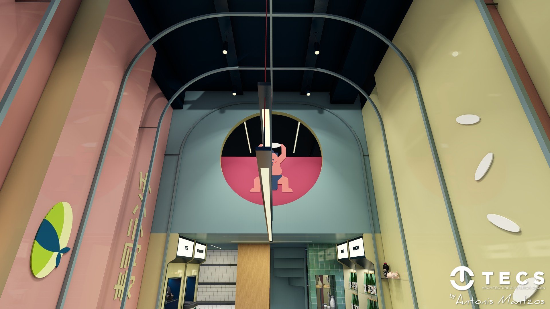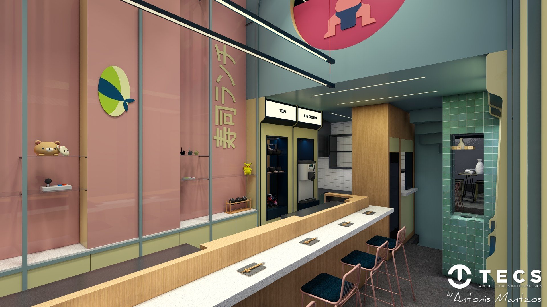 The design draws inspiration from 1990s Japanese arcade culture, blending bold colors, geometric forms, and playful lighting to create an immersive, high-impact dining environment.